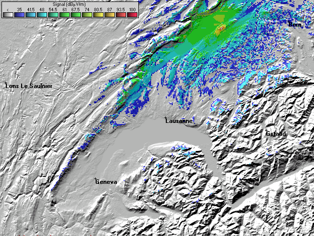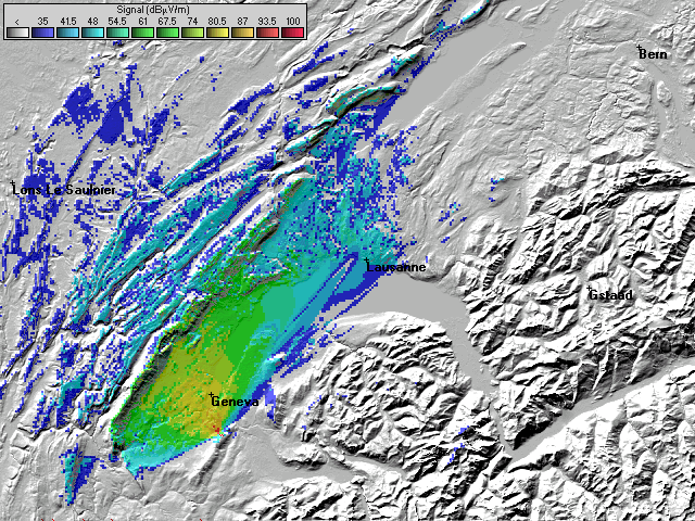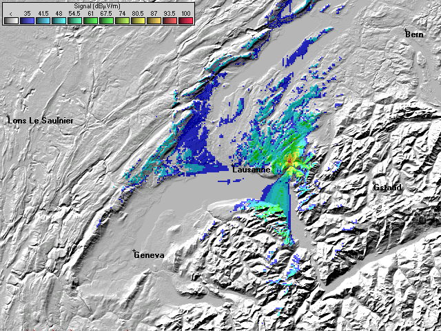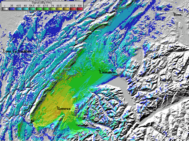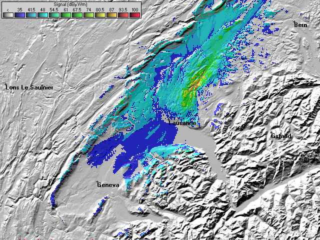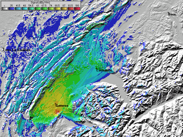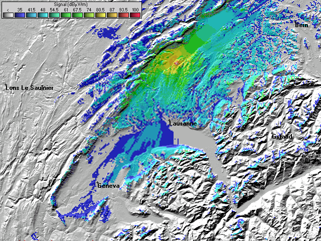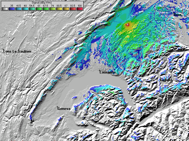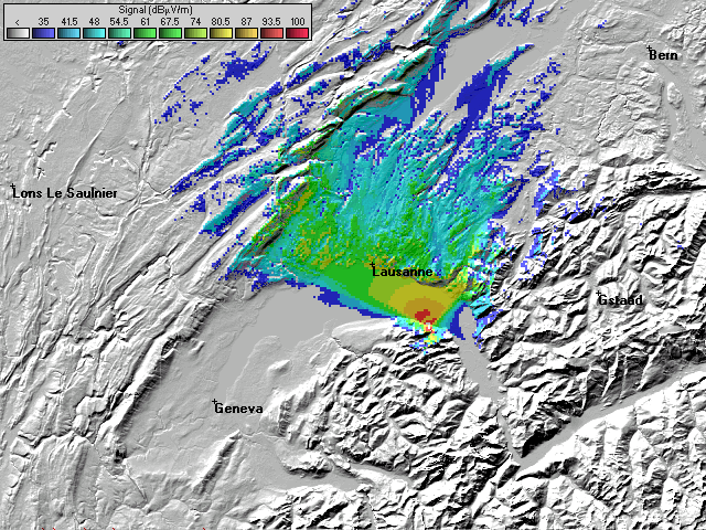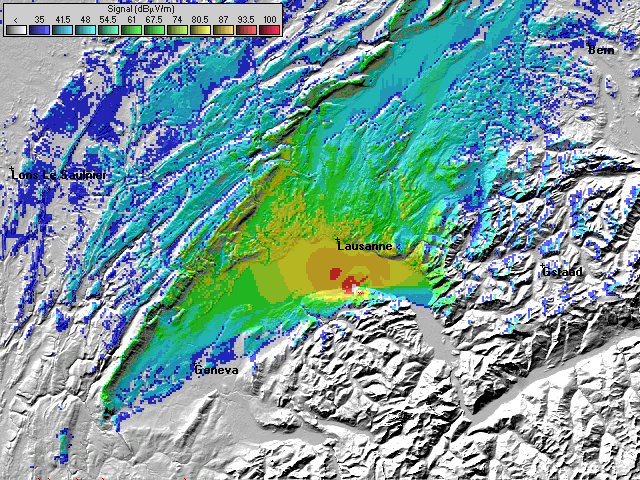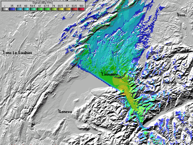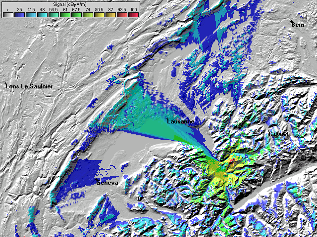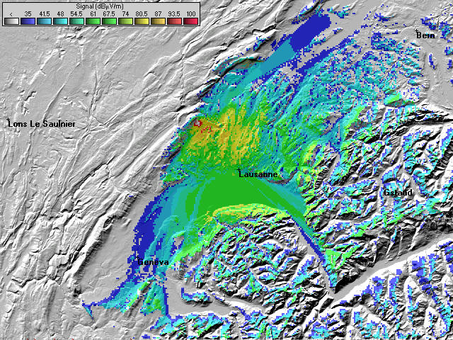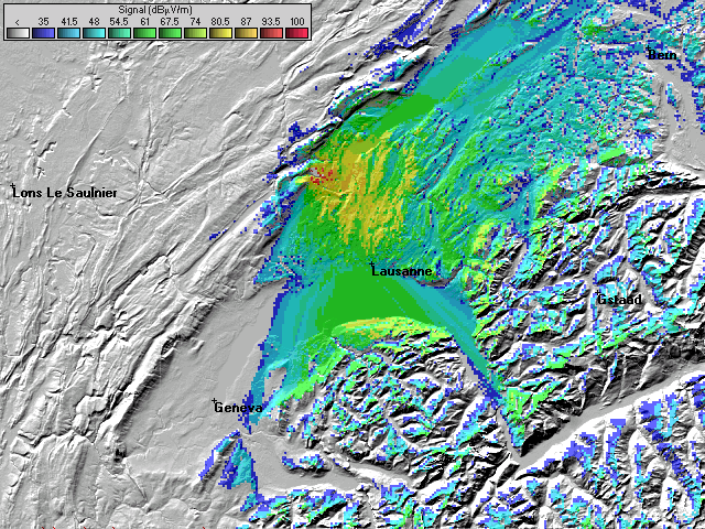 - Les couleurs indiquent la valeur de champs prédite à une hauteur de 10 mètres du sol (convention ITU).