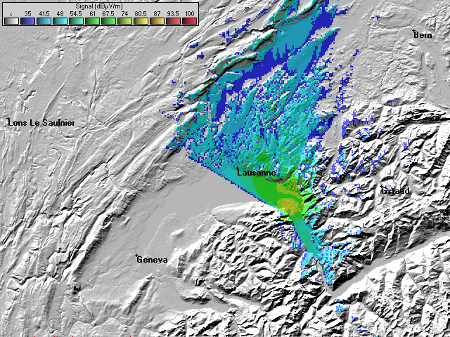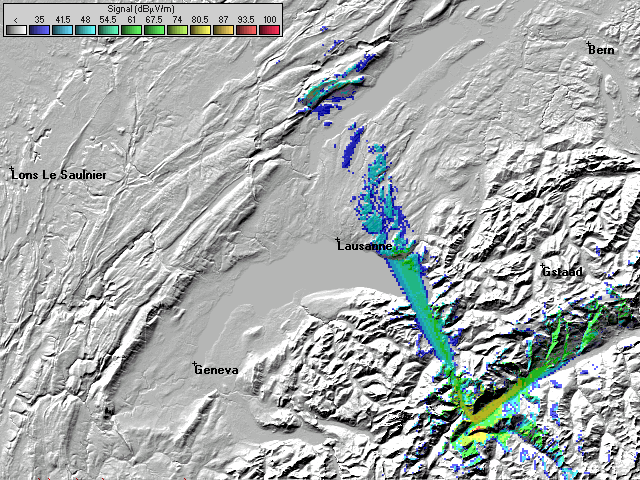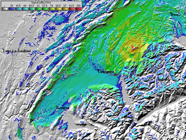 - L'échelle est en dBuV/m et est donc indépendante du récepteur et de son antenne. Elle va de 35dBuv/m a 100dBuV/m. Un récepteur peut capter un signal de 35dBuV/m si la fréquence n'est pas perturbée et que l'antenne est bonne. Néanmoins, les valeurs officielles (ITU) conseillent 54dBuV/m en milieu rural, 66dBuV/m en milieu urbain et 74dBuV/m en milieu urbain dense.