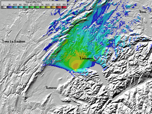 - Donnée techniques: Logiciel radio mobile (modèle semi-empirique Longley-Rice ou ITM Irregular Terrain Model), données de terrain SRTM à 100m de résolution, source de données des émetteurs OFCOM